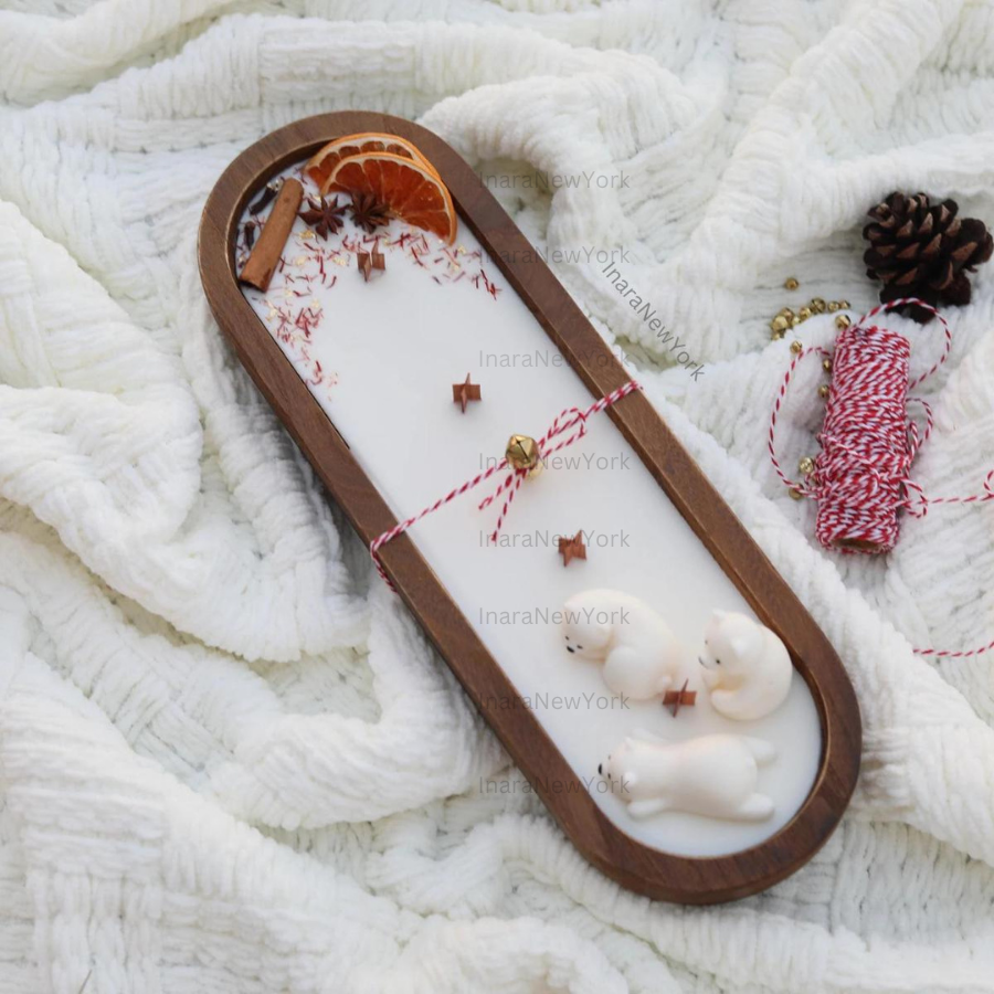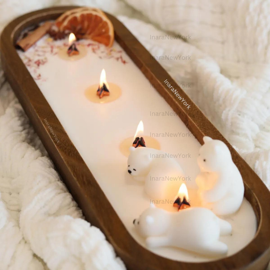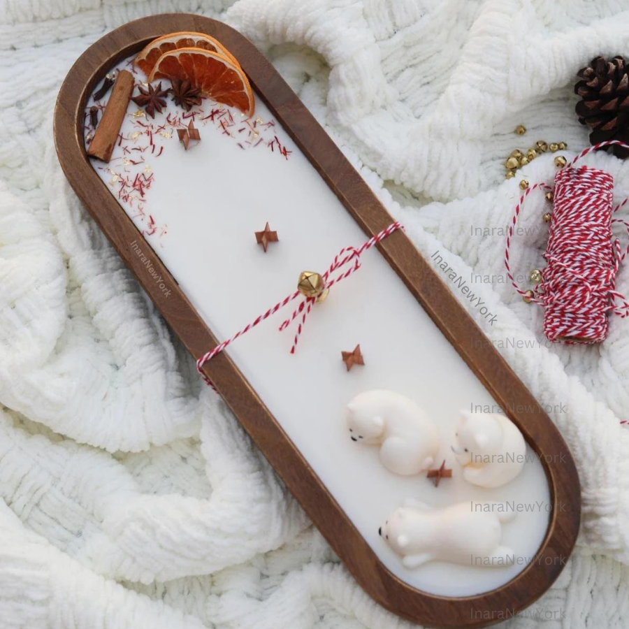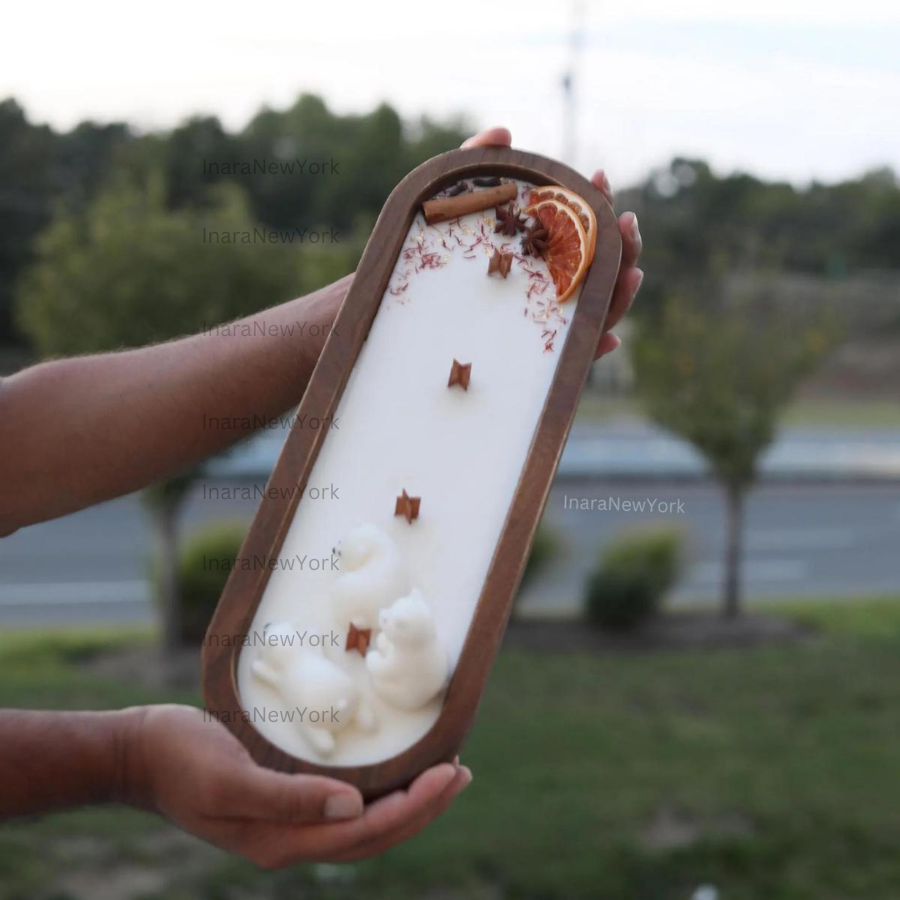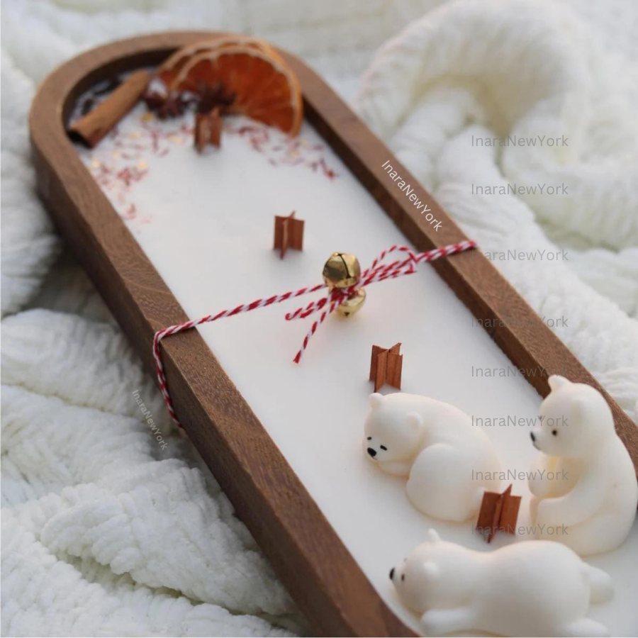 ❤ our candles wooden dough bowl is topped with real grapefruit slices, star anise, clove, cinnamon stick, saffron and a wax polar bear